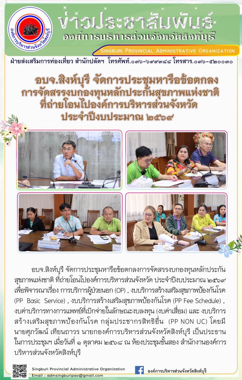 อบจ.สิงห์บุรี จัดการประชุมหารือข้อตกลงการจัดสรรงบกองทุนหลักประกันสุขภาพแห่งชาติที่ถ่ายโอนไปองค์การบริหารส่วนจังหวัด ประจำปีงบประมาณ 2568 [1 ตุลาคม 2568]