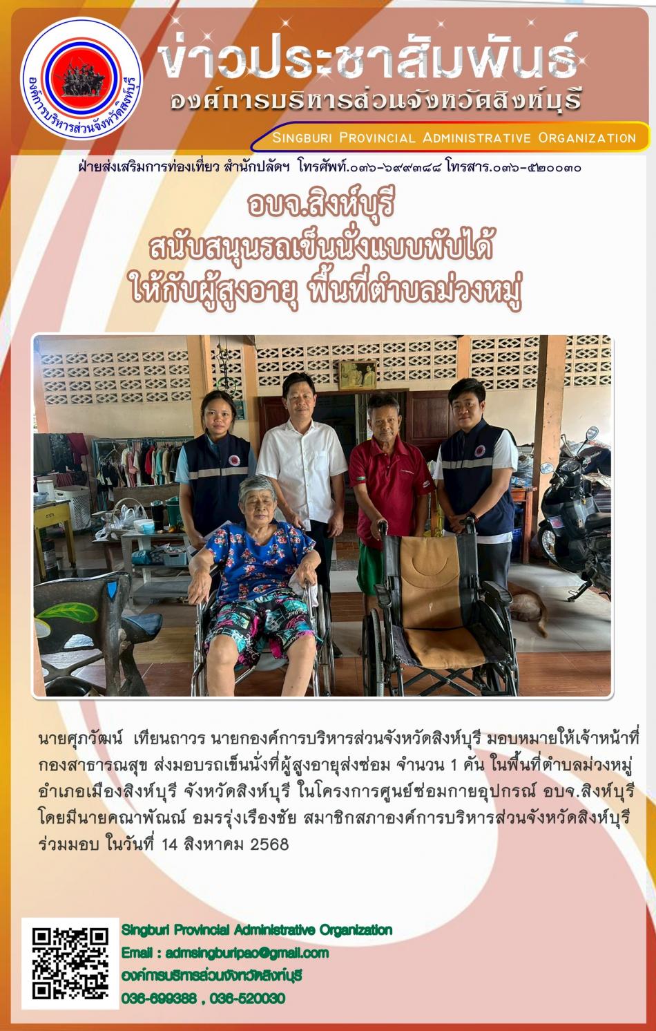 อบจ. สิงห์บุรี สนับสนุนรถเข็นนั่งแบบพับได้ให้กับผู้ พื้นที่ตำบลพื้นที่ตำบลม่วงหมู่ [14 สิงหาคม 2568]