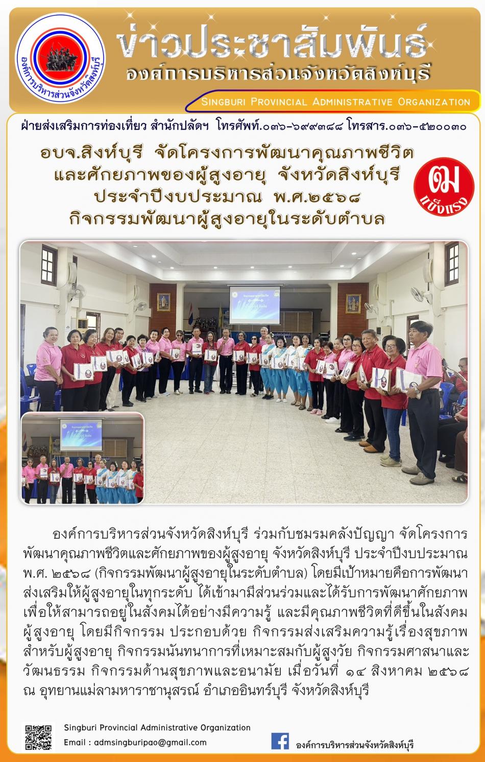 อบจ. สิงห์บุรี จัดโครงการพัฒนาคุณภาพชีวิตและศักยภาพของผู้สูงอายุ จังหวัด สิงห์บุรี ประจำประจำปีงบประมาณปี พ. ศ. 2568 กิจกรรมพัฒนาผู้สูงอายุในระดับตำบลกิจกรรมพัฒนาผู้สูงอายุในระดับตำบล [14 สิงหาคม 2568]