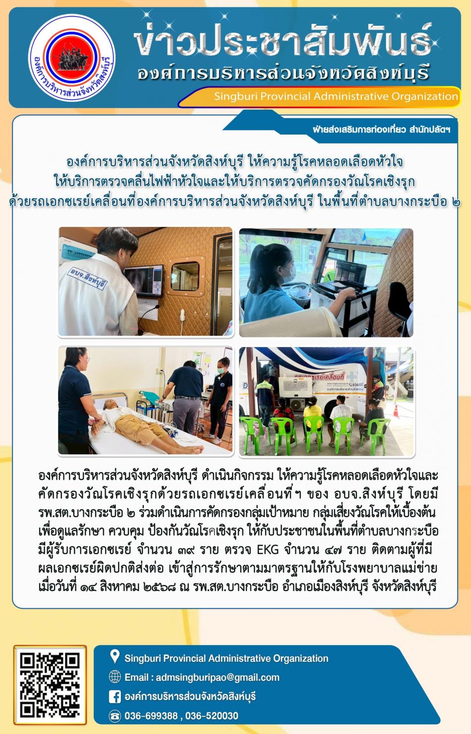 องค์การบริหารส่วน ให้ความรู้โรคหลอดเลือดหัวใจ ให้บริการเกิดขึ้นไฟฟ้าหัวใจและให้บริการคัดกรองวัณโรคเชิงชนร ด้วยรถเอ็กซเรย์เคลื่อนที่องค์การบริหารส่วนจังหวัดส่วน ในพื้นที่ตำบลในพื้นที่ตำบลบางกระบือ 2 [14 สิงหาคม 2568]