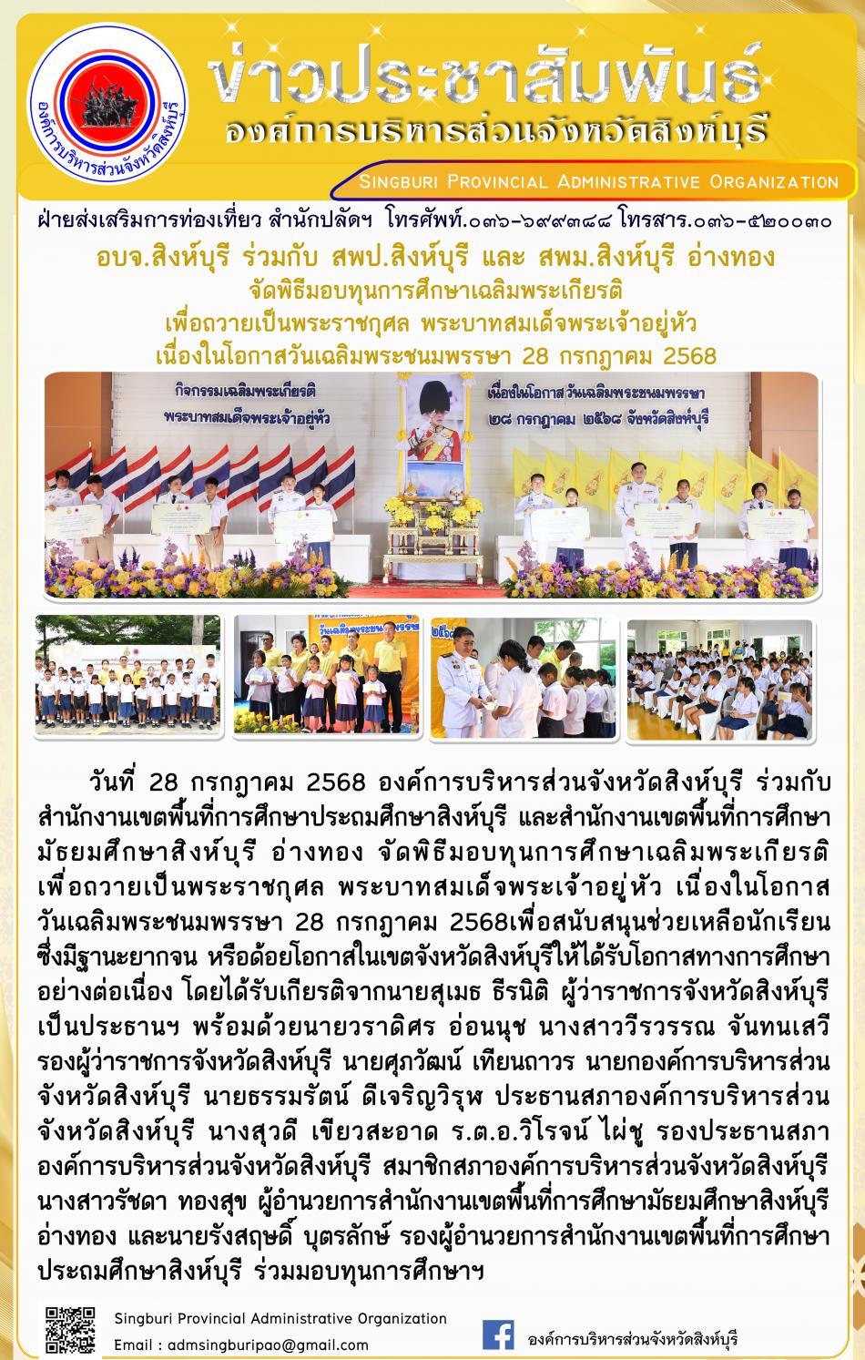 อบจ.สิงห์บุรี ร่วมกับ สพป.สิงห์บุรี และ สพม.สิงห์บุรี อ่างทอง จัดพิธีมอบทุนการศึกษาเฉลิมพระเกียรติ เพื่อถวายเป็นพระราชกุศล พระบาทสมเด็จพระเจ้าอยู่หัว เนื่องในโอกาสวันเฉลิมพระชนมพรรษา 28 กรกฎา 2568 [28 กรกฎาคม 2568]