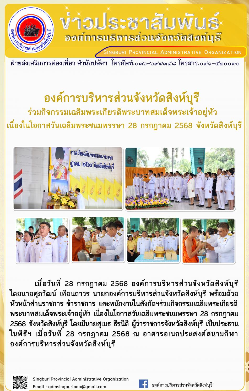 องค์การบริหารส่วนจังหวัดสิงห์บุรี ร่วมกิจกรรมเฉลิมพระเกียรติพระบาทสมเด็จพระเจ้าอยู่หัว เนื่องในโอกาสวันเฉลิมพระชนมพรรษา 28 กรกฎาคม 2568 จังหวัดสิงห์บุรี [28 กรกฎาคม 2568]