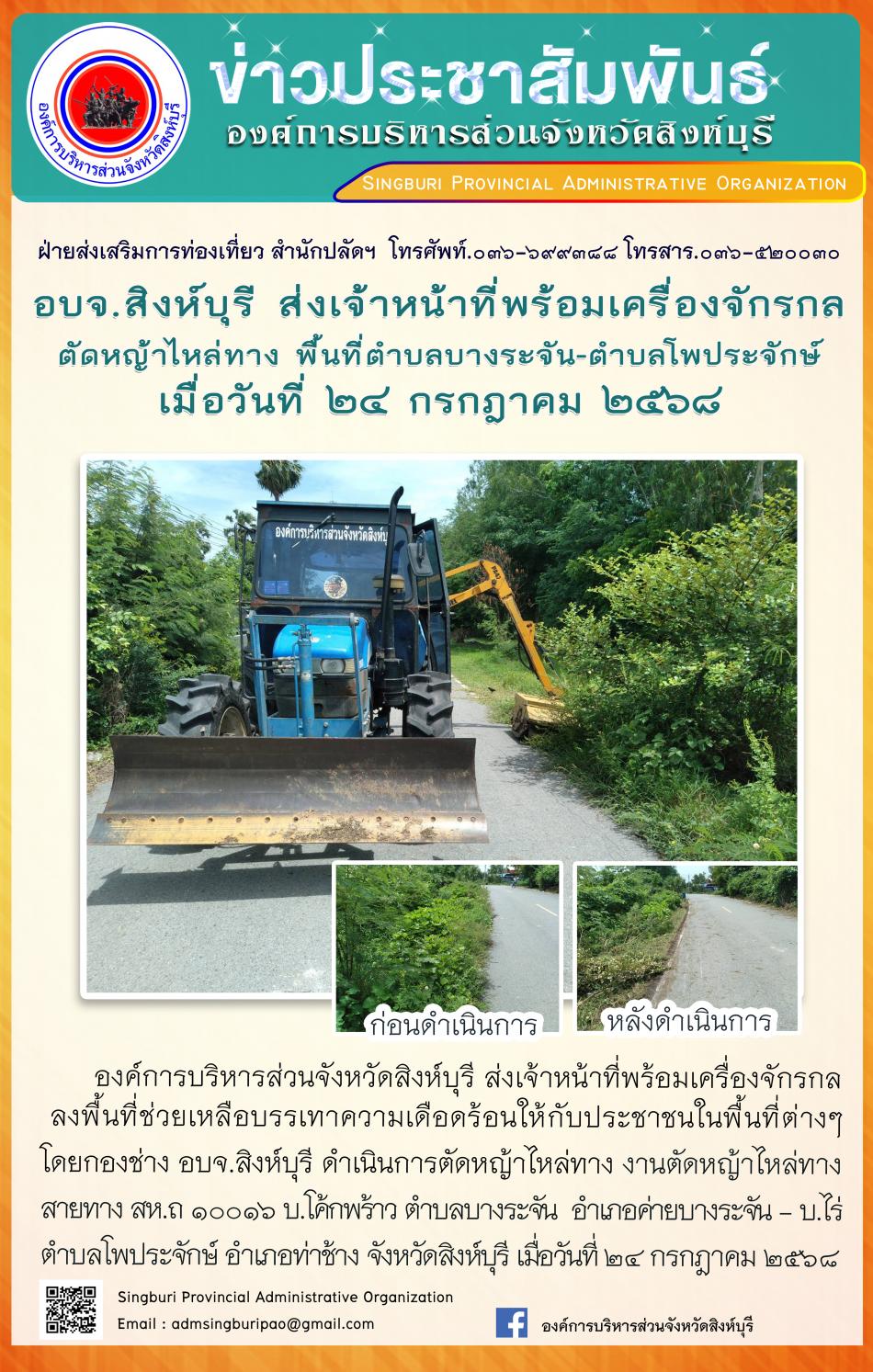 อบจ.สิงห์บุรี ส่งเจ้าหน้าที่พร้อมเครื่องจักรกล ตัดหญ้าไหล่ทาง พื้นที่ตำบลบางระจัน - ตำบลโพประจักษ์ [24 กรกฎาคม 2568]