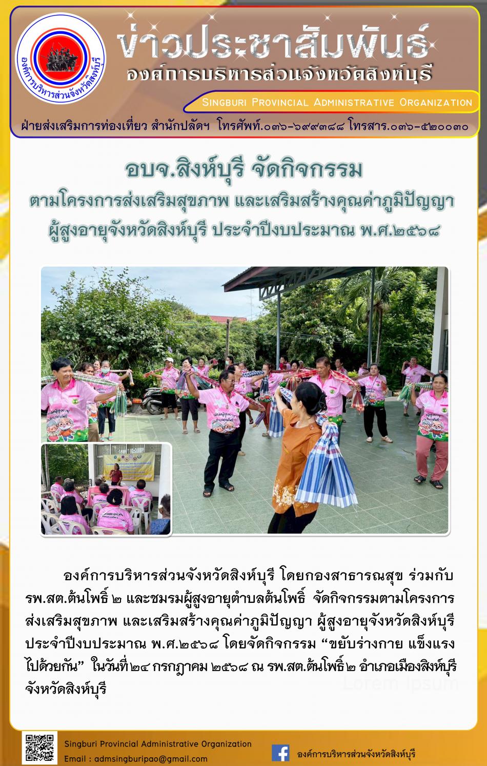 อบจ.สิงห์บุรี จัดกิจกรรมตามโครงการส่งเสริมสุขภาพ และเสริมสร้างคุณค่าภูมิปัญญาผู้สูงอายุจังหวัดสิงห์บุรี ประจำปีงบประมาณ พ.ศ.2568 [24 กรกฎาคม 2568]