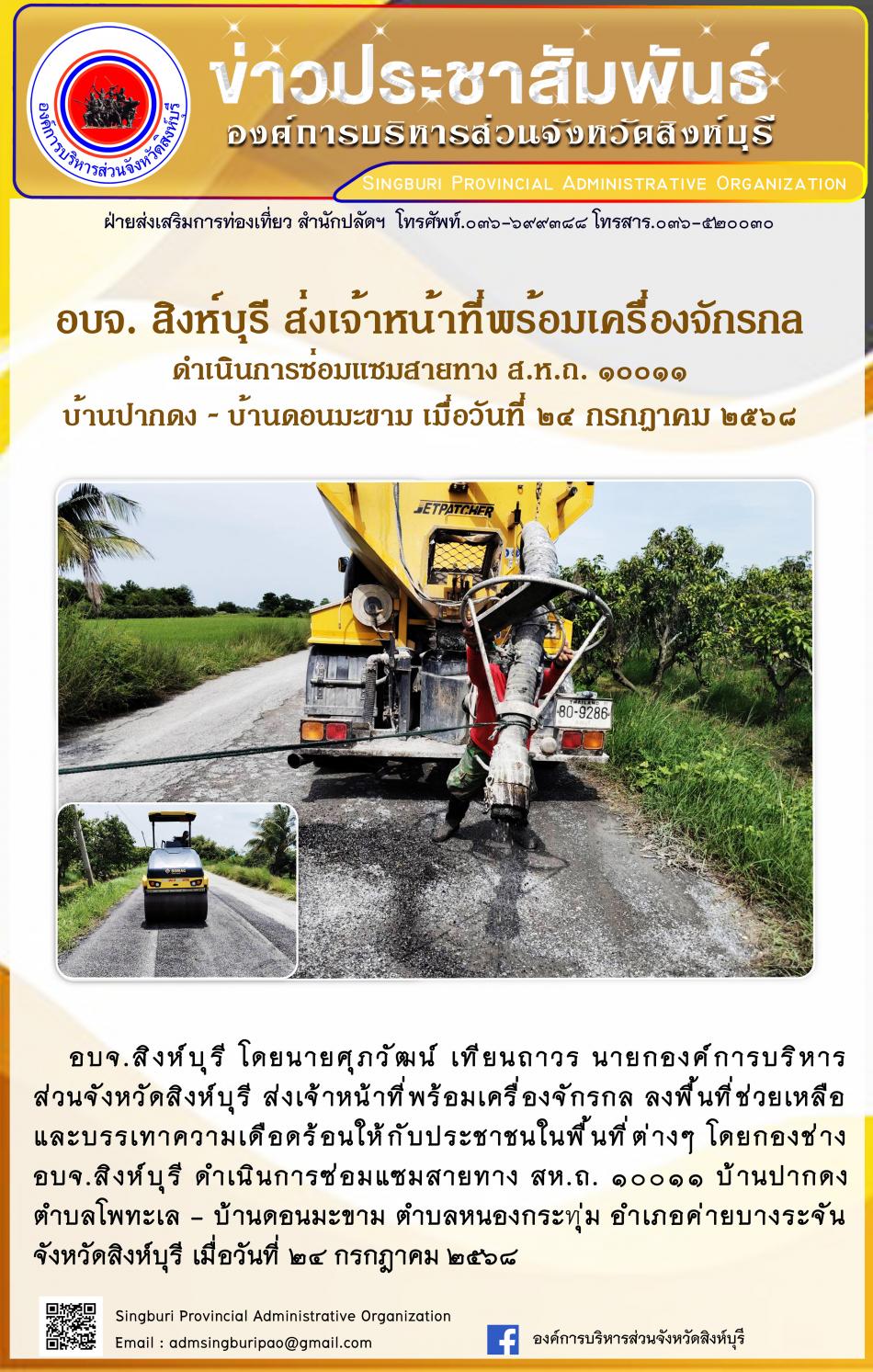 อบจ.สิงห์บุรี ส่งเจ้าหน้าที่พร้อมเครื่องจักรกล ดำเนินการซ่อมแซมสายทาง ส.ห.ถ.10011 บ้านปากดง - บ้านดอนมะขาม [24 กรกฎาคม 2568]
