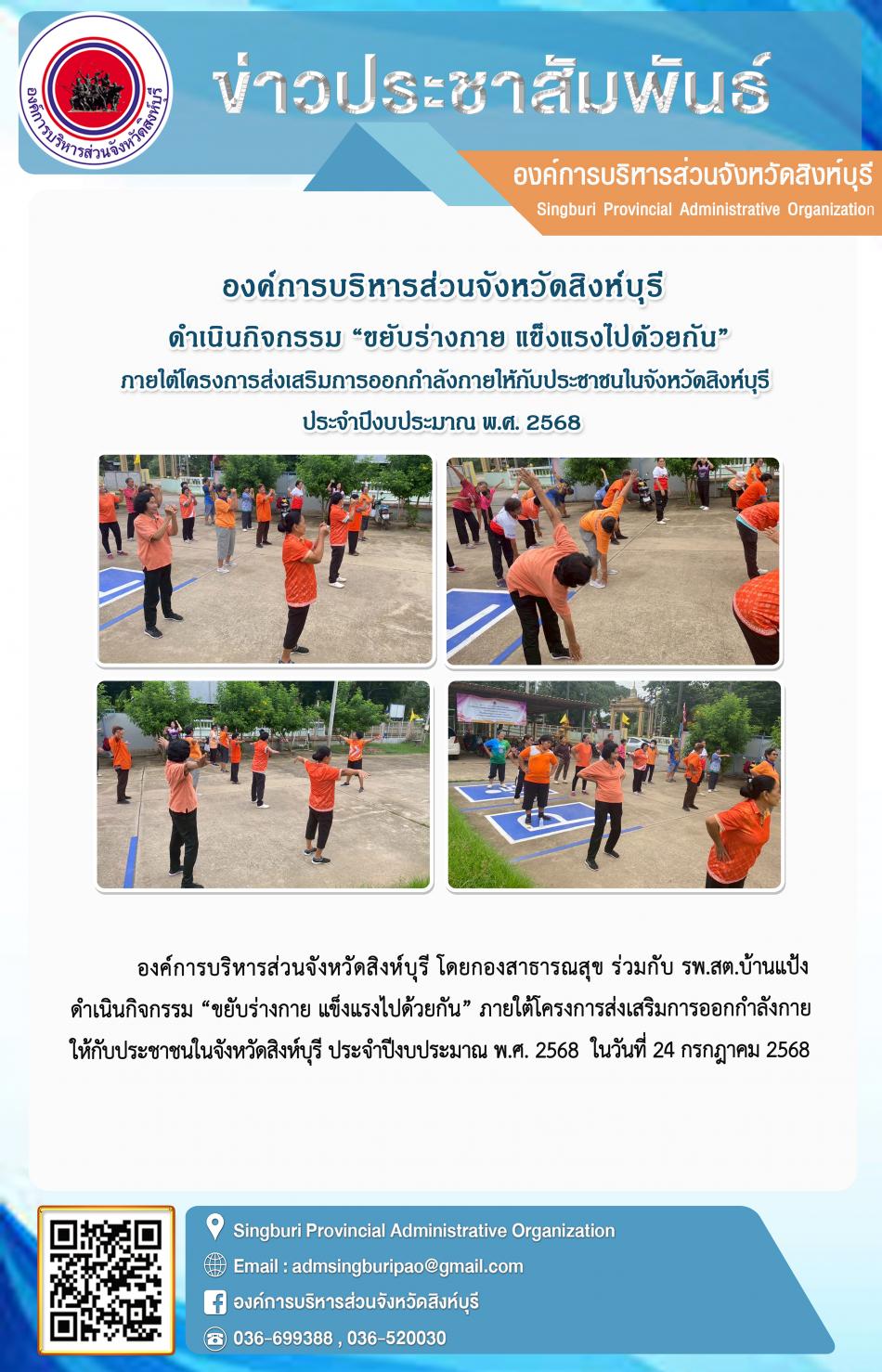 องค์การบริหารส่วนจังหวัดสิงห์บุรี ดำเนินกิจกรรม "ขยับร่างกาย แข็งแรงไปด้วยกัน " ภายใต้โครงการส่งเสริมการออกกำลังกายให้กับประชาชนในจังหวัดสิงห์บุรี ประจำปีงบประมาณ พ.ศ.2568 [24 กรกฎาคม 2568]